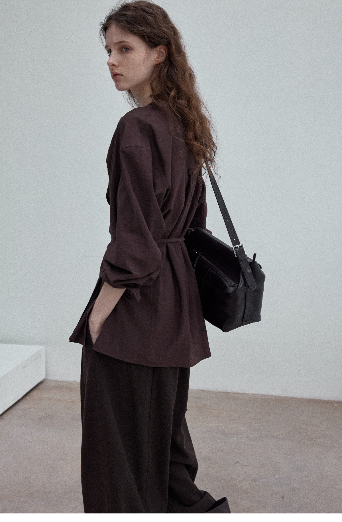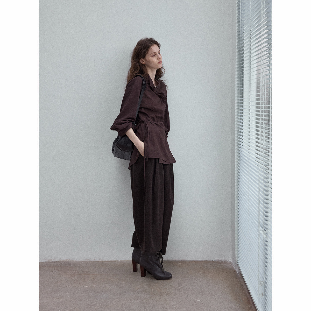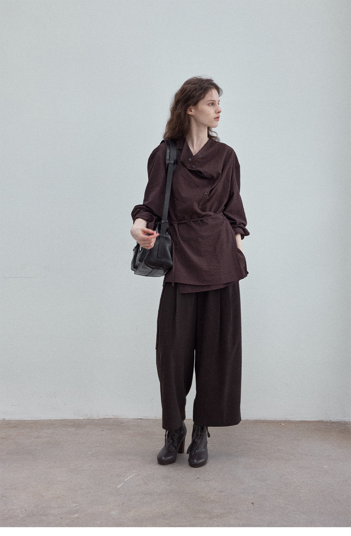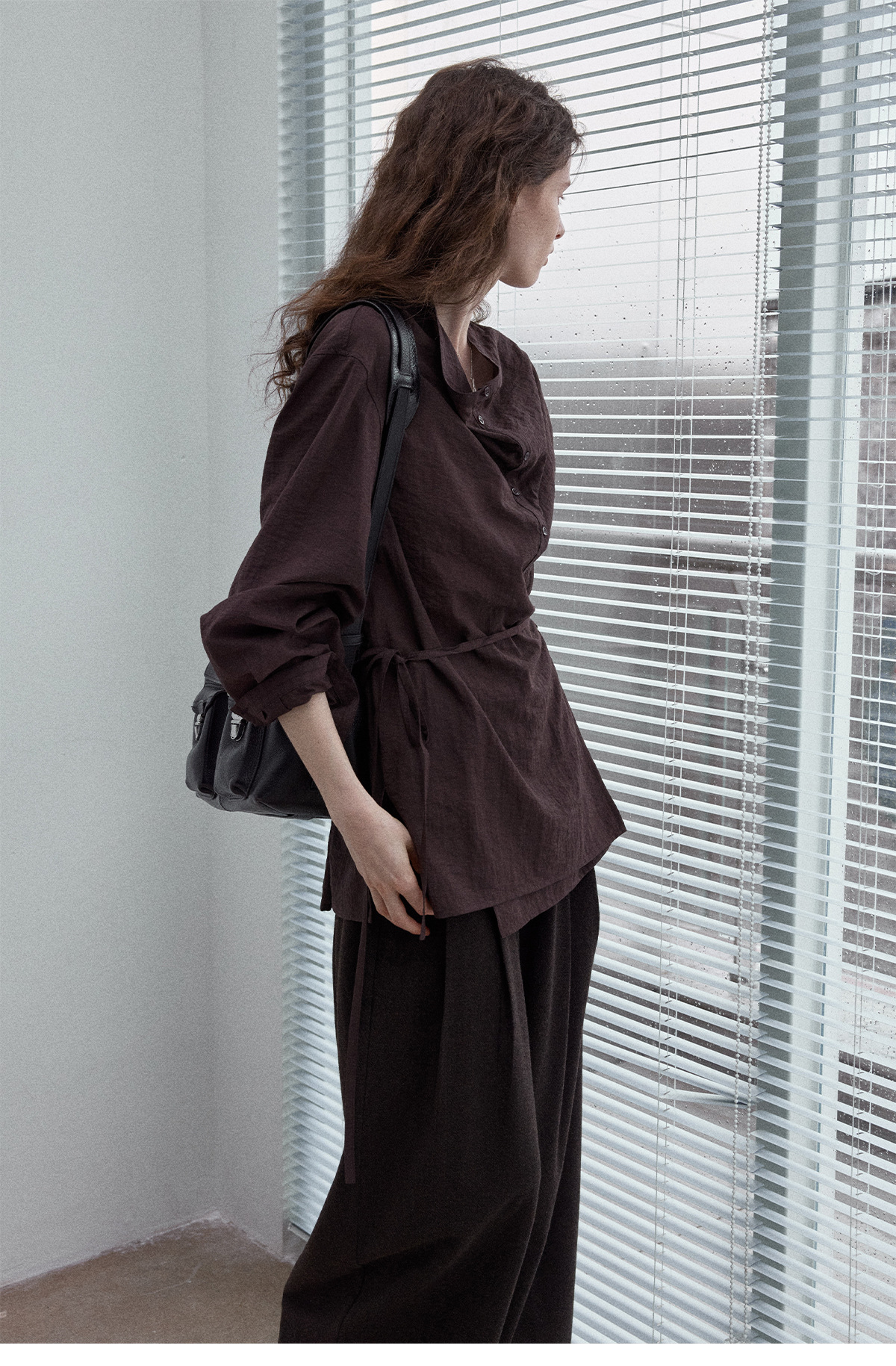 Natural breathable linen tailored turtleneck shirt, autumn everyday commuting long-sleeved women's brown color