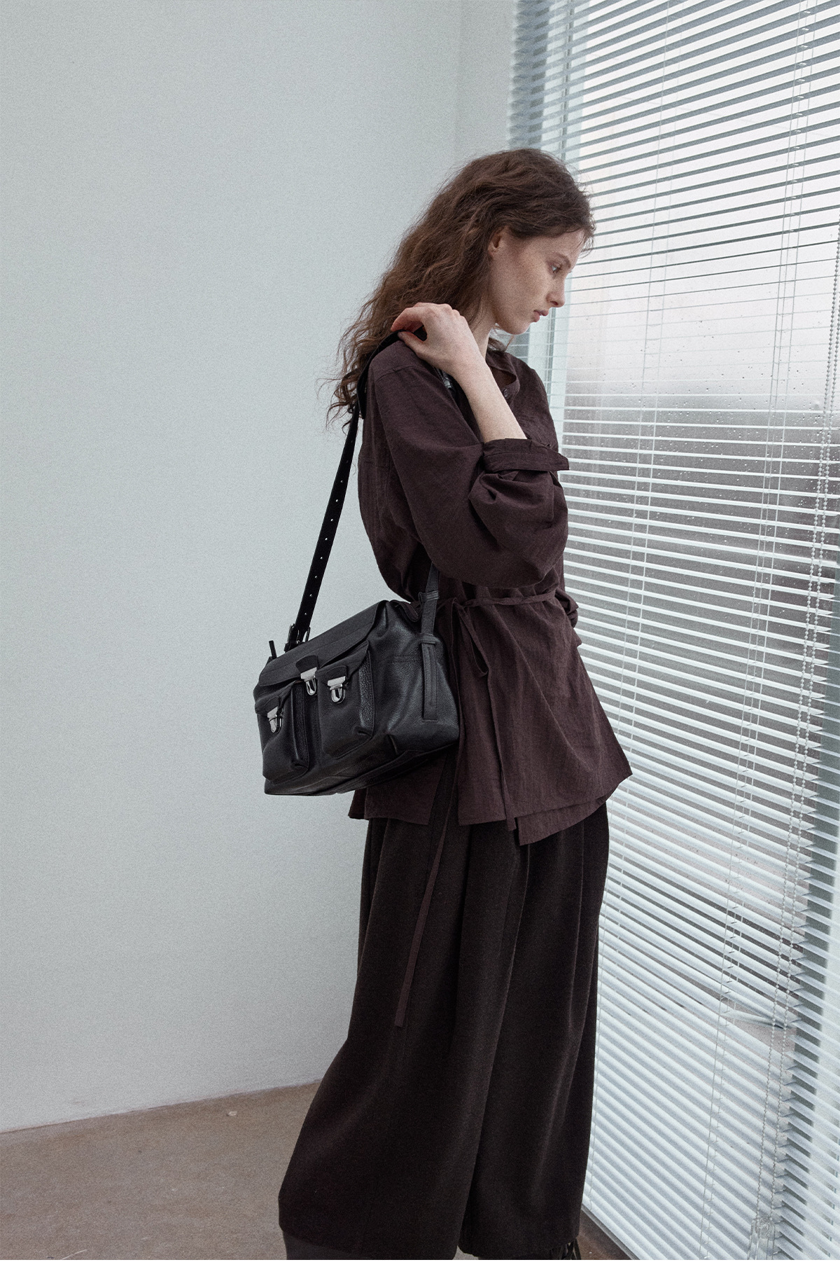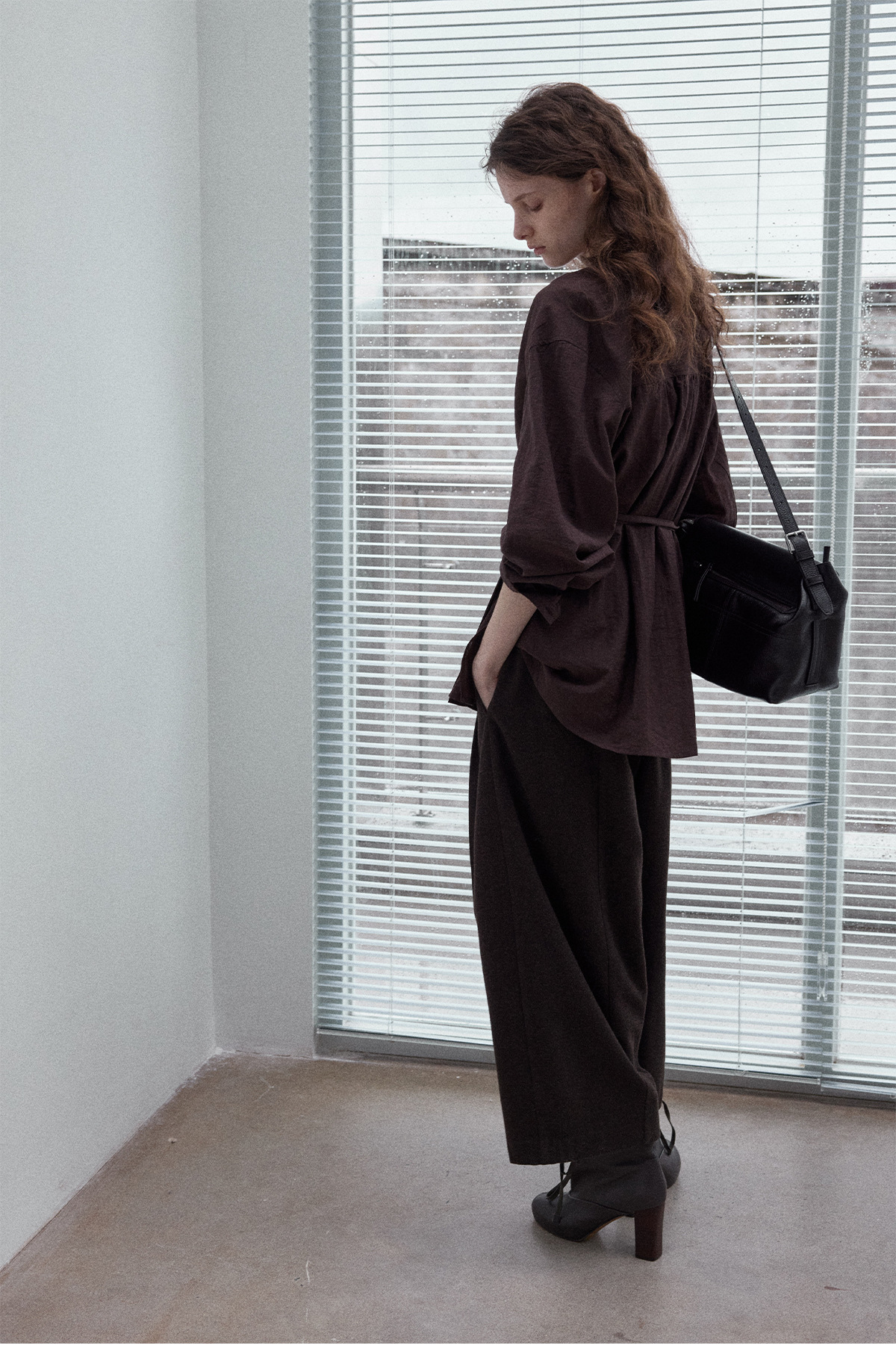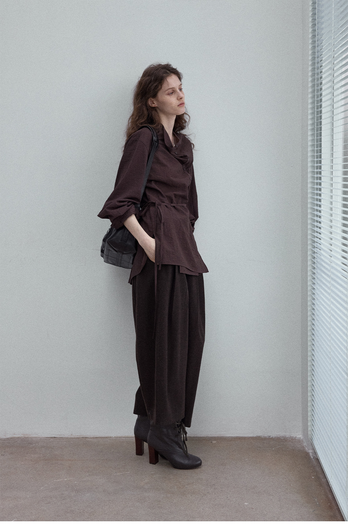 Natural breathable linen tailored turtleneck shirt, autumn everyday commuting long-sleeved women's brown color